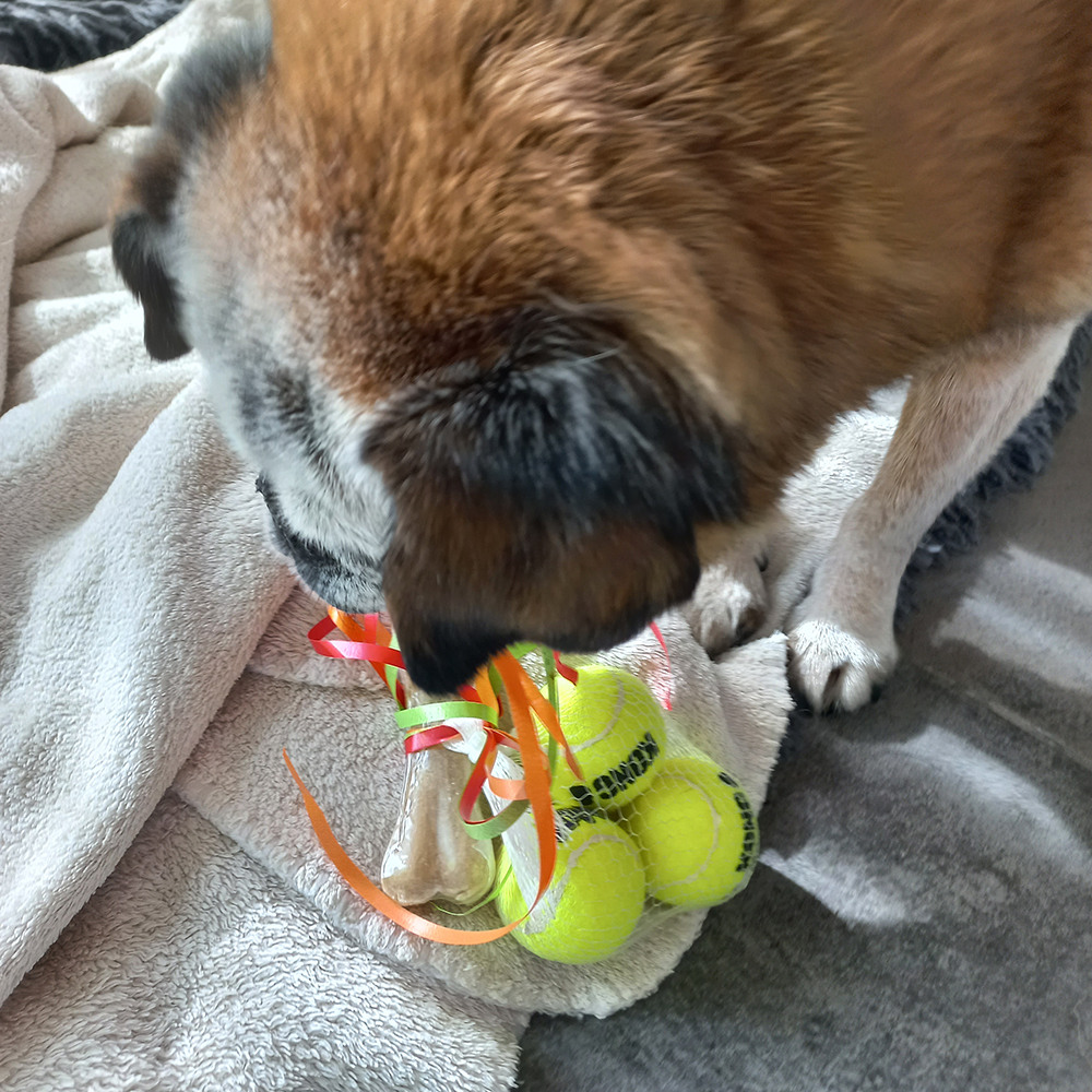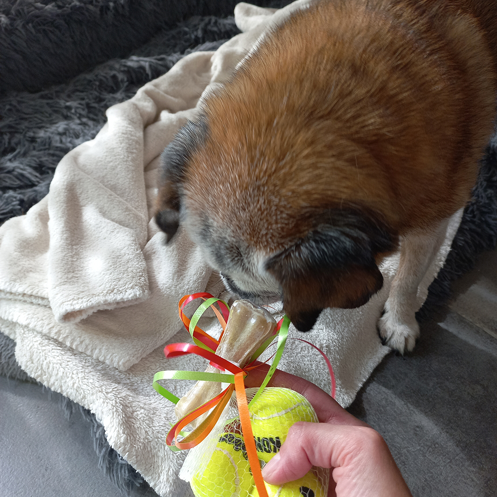 Vanmiddag kreeg hij een lekker botje en natuurlijk een netje met kleine balletjes. Die hond leeft voor balletjes.