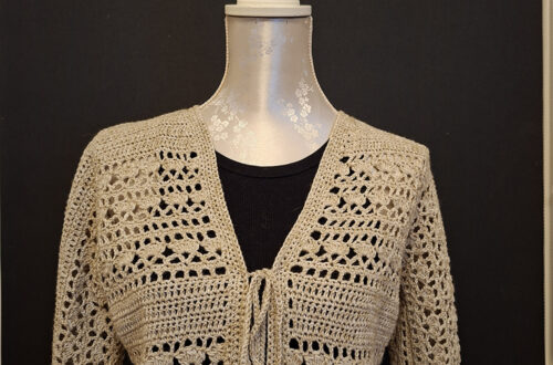 Het is gehaakt van 100% katoen. Vroeger gebruikten ze deze steek, de filetsteek, vooral voor gordijntjes. Goh, daar heb ik er ook wat van gehaakt hoor!