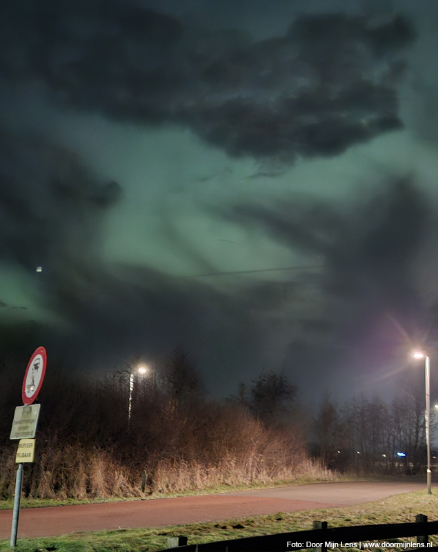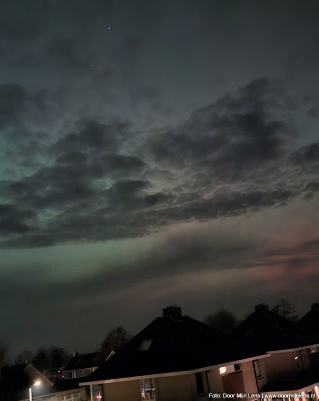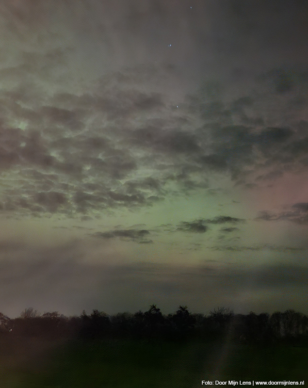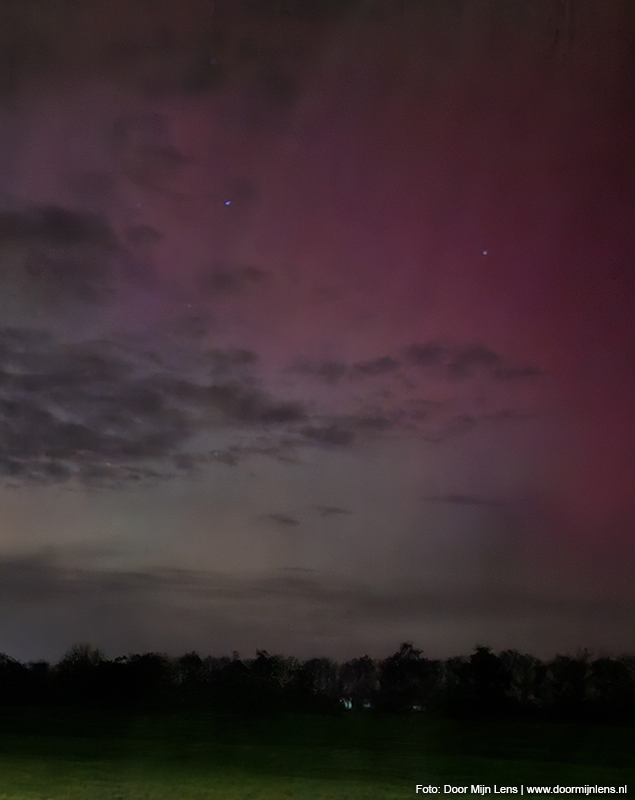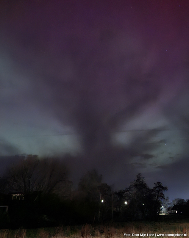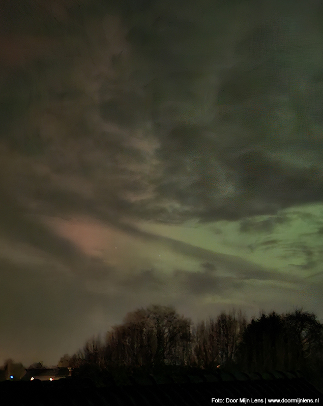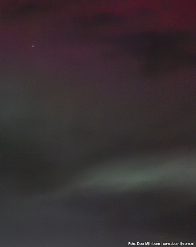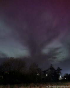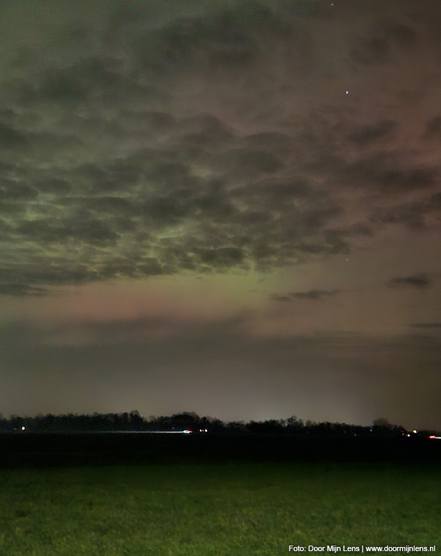 Vanuit mijn hobbykamer boven, op zolder, zag ik het nog steeds gloeien aan de hemel. En toen kon ik het niet laten: jas aan, camera mee, fiets gepakt. Het was inmiddels half twaalf ’s avonds, maar dat maakte niets uit. Op naar Dokkum. Richting de weilanden. Meer ruimte, minder licht, meer magie.