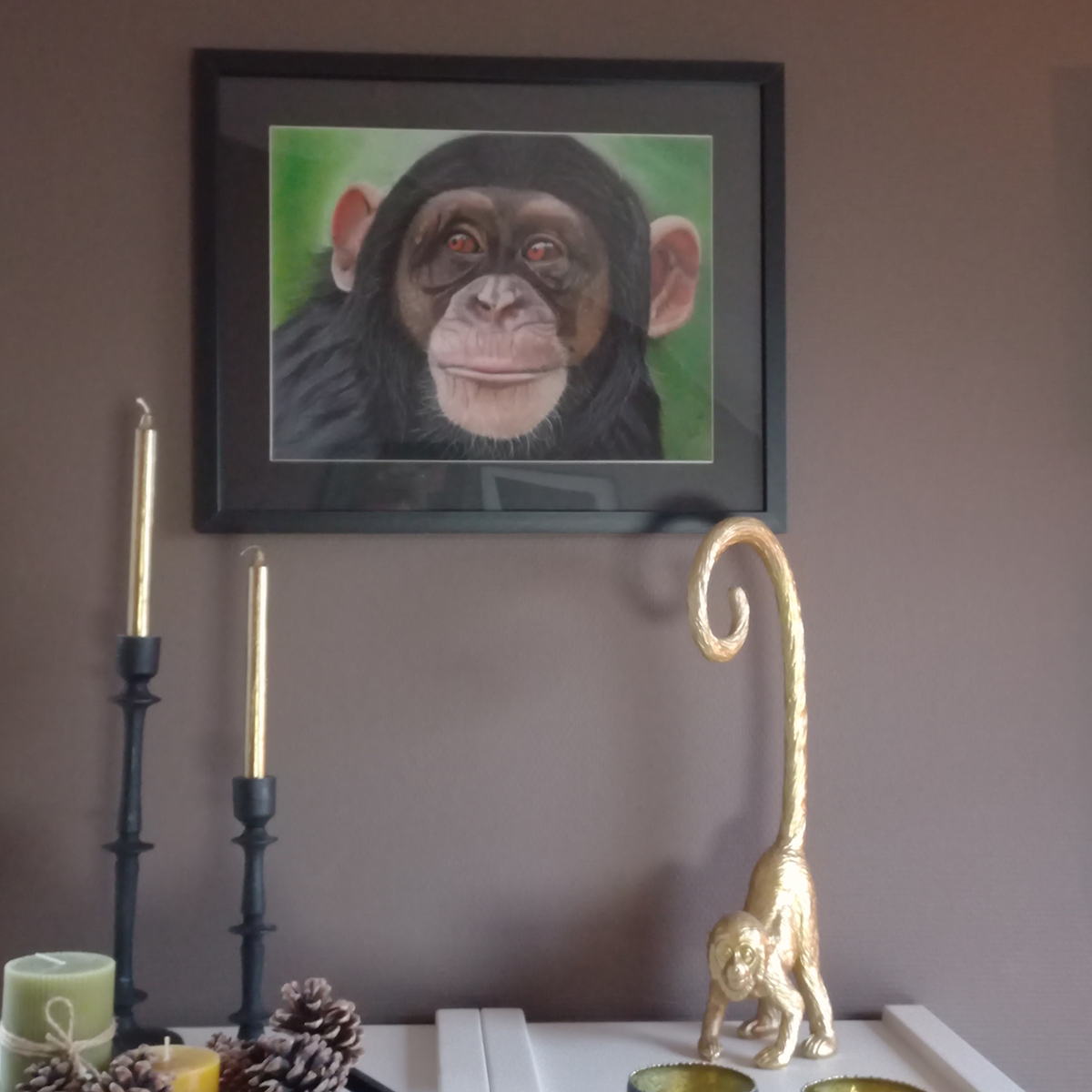 Daarna kwam het leukste moment: inlijsten! Ik heb gekozen voor een strakke zwarte passe-partout en lijst. En nu hangt mijn chimpansee trots aan de muur in mijn hobbykamer.